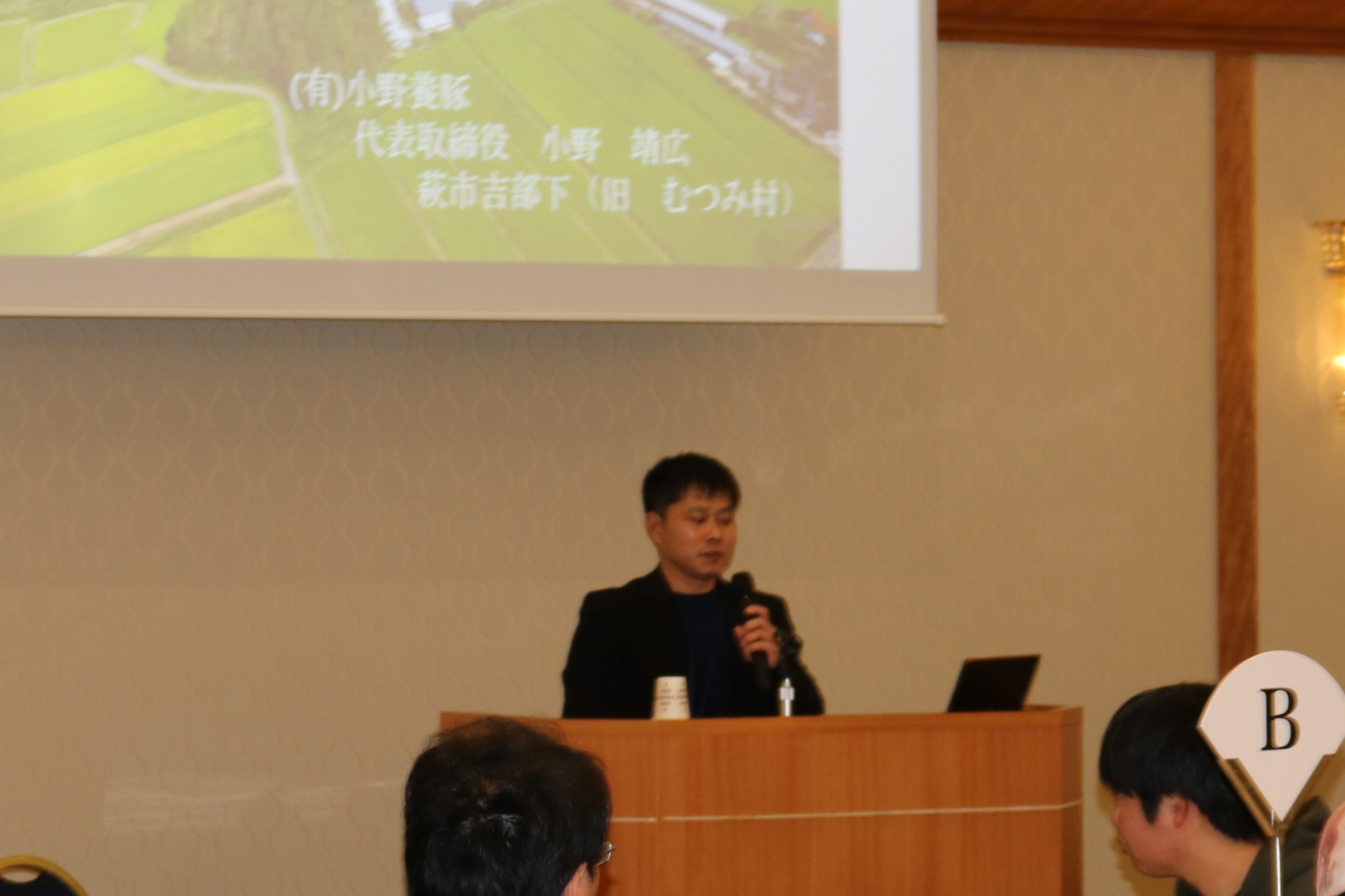 続いて、有限会社小野養豚 代表取締役の小野靖広さんから「農業法人が求める人材について」と題して講演がありました。